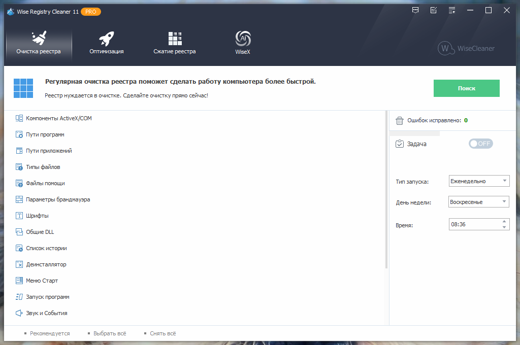 - Глубокий и быстрый скан реестра на наличие ошибок и устаревших элементов