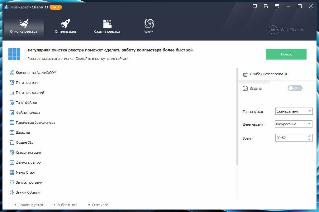 - Настраиваемое планирование автоматической очистки и дефрагментации реестра