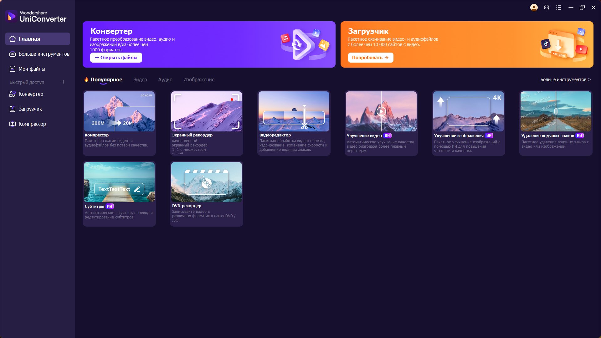 Wondershare UniConverter объединяет в себе широкий спектр инструментов для обработки мультимедийных файлов в одном удобном интерфейсе. Программа позволяет выполнять задачи любой сложности — от быстрого конвертирования до профессионального редактирования видеофайлов.