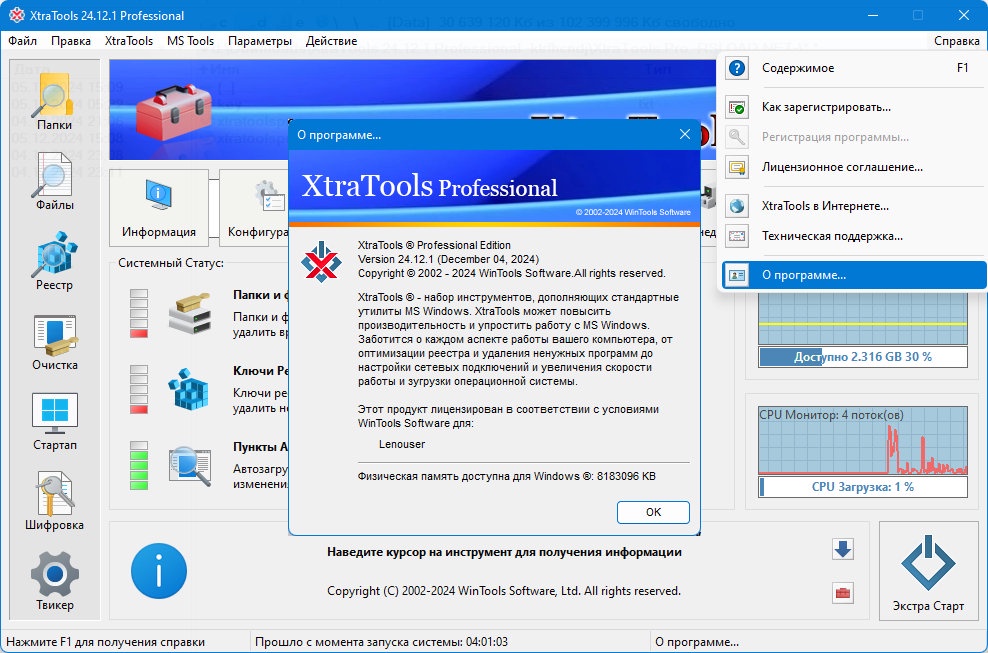 XtraTools Professional — это мощный и универсальный набор инструментов для оптимизации и обслуживания системы Windows. Программа предназначена для повышения скорости работы компьютера, очистки системы от ненужных файлов и настройки различных аспектов операционной системы, обеспечивая более стабильную и эффективную работу ПК.