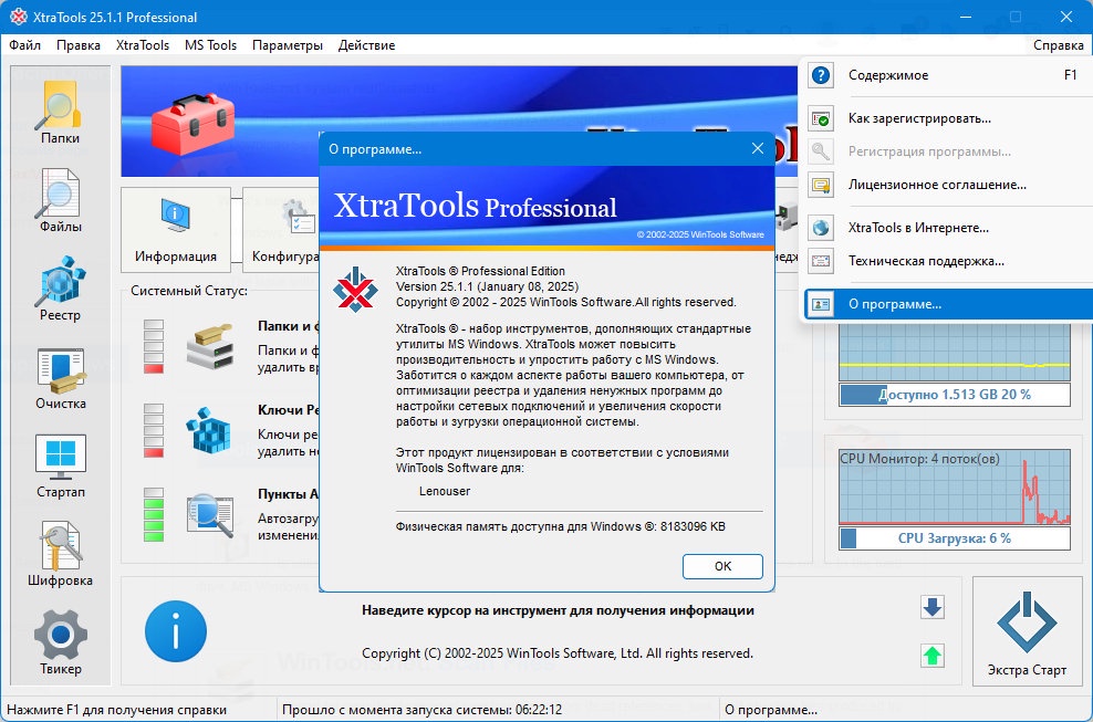 XtraTools Professional — это мощный и универсальный набор инструментов для оптимизации и обслуживания системы Windows. Программа предназначена для повышения скорости работы ПК, очистки системы и настройки различных аспектов операционной системы, обеспечивая пользователю полный контроль и удобство в управлении.