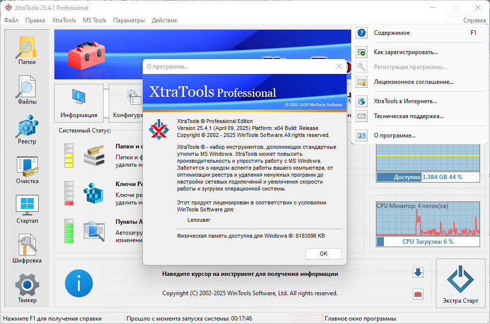 XtraTools Professional — это мощный набор инструментов для оптимизации и настройки операционной системы Windows, направленный на повышение производительности, безопасность и удобство использования ПК. Программа предлагает широкий спектр функций, позволяющих управлять системными ресурсами и следить за работой компьютера.