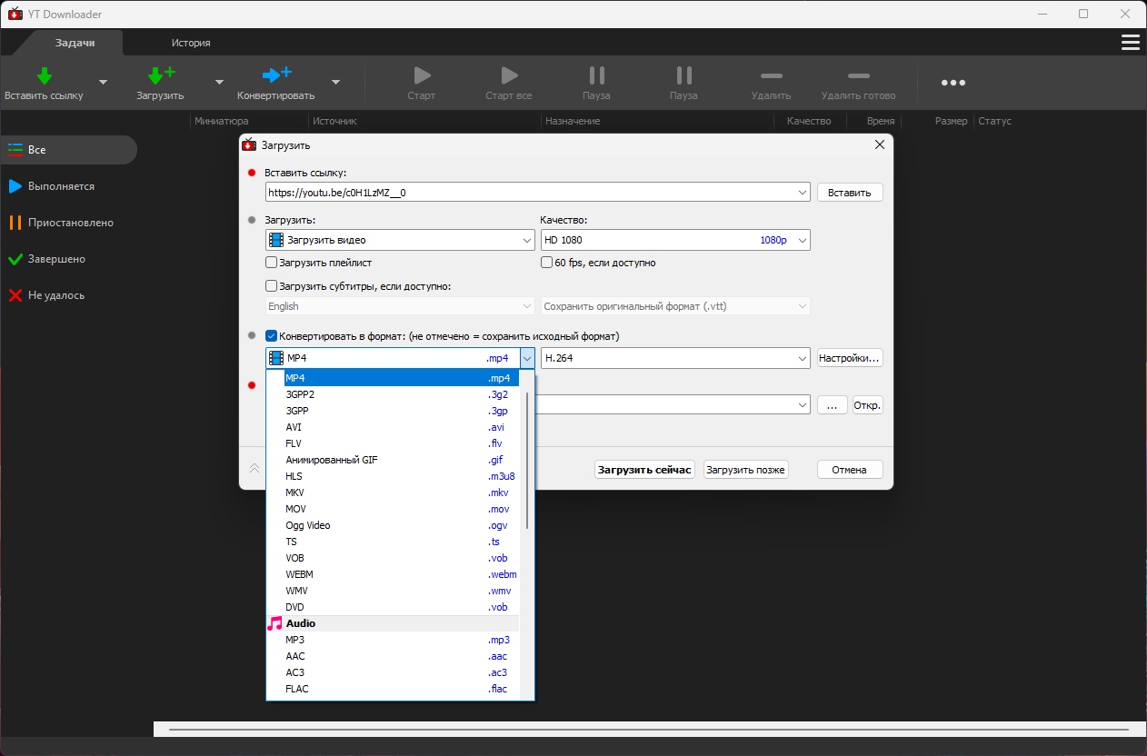 - Массовая загрузка плейлистов с YouTube с автоматическим сохранением всех выбранных видео.